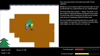 In this game, you must keep a creature alive as you make your way off a mountain top. You have no idea how you got there, but the creature was there when you awoke and it relies entirely on you to survive. Gather food, keep your fire going, learn to fight, and craft multiple upgrades on your way down the mountain.